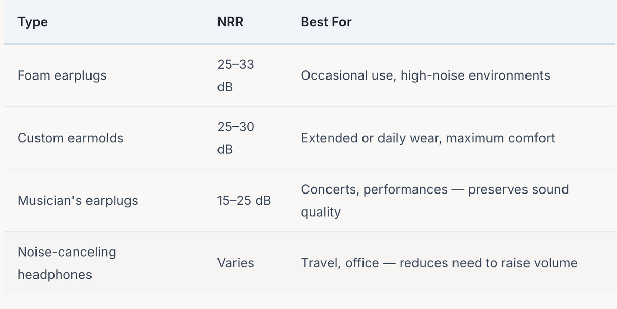 Not all hearing protection is the same, and choosing the right type for the situation makes a real difference. The Noise Reduction Rating (NRR) on hearing protection tells you how many decibels it reduces exposure by. NIOSH recommends selecting protection rated appropriately for your specific noise environment.[4]